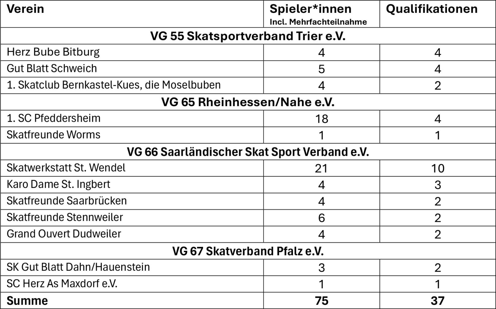 Der Skatverband Rheinland-Pfalz/Saarland war mit 48 Spieler*innen bei dem Turnier vertreten. Es gab Spieler*innen die mehrfach antraten. Grund: Zweiter Versuch oder einfach bis zu dreimal, weil es Spaß gemacht hat.