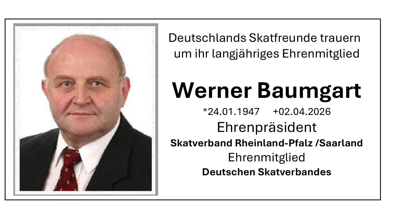 Mit Werner Baumgart verliert der Skatverband Rheinland-Pfalz/Saarland e.V. eine seiner prägendsten Persönlichkeiten. Sein Name war über Jahrzehnte untrennbar mit der Organisation und Förderung unseres Spiels verbunden. Als langjähriger Präsident agierte er stets mit Weitsicht, Sachverstand und einer tiefen Leidenschaft für das Skat-Spiel.